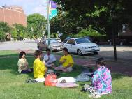 7月14日,上午天晴日朗,学员们骑了近4个小时,到达了弗吉尼亚州的里士满(Richmond)市。下午他们和当地的学员一起在就近的一个公园里炼功洪法。
