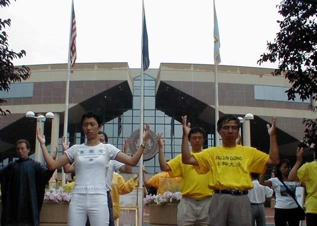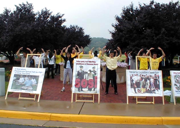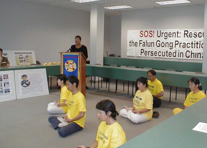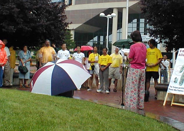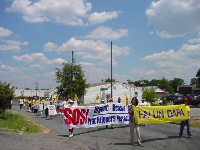 7月15日,上午当地学员和北上车队学员在市内公园召开了记者招待会。华盛顿DC的学员也前来一起协助这次活动。会前学员们做了功法表演。会后双方学员接受了媒体的采访。之后他们来到华人街做了紧急救援中国学员的游行并向沿路的人做宣传。之后,写有法轮大法和紧急救援的地方学员的汽车车队送北自行车队上路。