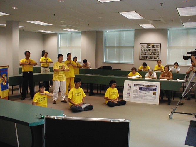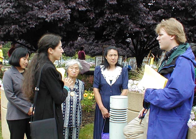 在游行开始前的记者招待会上,来自滑铁卢的大法弟子做了感人肺腑的发言。为了让更多人了解法轮功真相,也同时让善良的人伸出援助之手,制止江泽民对法轮功学员的虐杀,四名大法弟子长途跋涉六天到达多伦多,他们之中有60多岁的阿姨,也有才16岁的小孩,走得脚都磨出了泡,只为了替大陆蒙冤的千万大法弟子们讨回公道,为了唤醒世人沉睡的良知 。他们的护法壮举深深地激励了在场的学员,许多人都流下了眼泪。