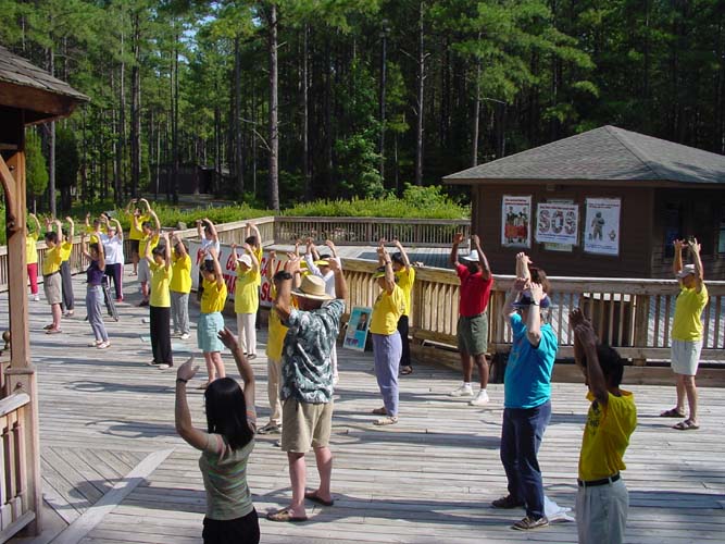 今天是6月17日,我们行程的第二天。我们的车队到达了北卡的格林斯堡,11点我们被当地的一家电视台邀请拍摄一个有关法轮功的录像片,他们请我们展示功法。学员们积极配合,为了能将这万古难遇的大法及其洪大、庄严,神圣展示给广大善良的人们,12位学员心念纯净,心生慈悲,动作认真、整齐,协调地演示了全部五套功法。在场的人感受到了强大的慈悲的能量场,令人感动,落泪。一位参加演示的学员真诚地说:“当我在摄影棚接受拍摄时,我的眼前浮现出伟大的师尊教给我们五套功法的画面。慈悲的师尊将伟大的佛法传给了我们,而将佛法告诉更多的人就是我最神圣的职责。”很多学员也有同感。
