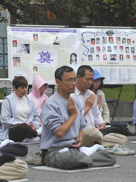 学员们在现场展示了许多国内同修被酷刑折磨的图片,在人来人往的中国城花园角广场吸引了许多民众。三位湾区学员还现场讲述了他们在回中国大陆时被关押甚至被毒打的经历。最小的一位是美国出生的林依力小妹妹。林小妹妹今年九岁,去年在随妈妈回国探亲时只是因为承认是法轮功学员就被警察非法拘留,并且与母亲分开关押。两天的关押中没有任何食物,只有水喝。最不堪忍受的是,在上厕所的时候警察不许她们关门,完全不尊重一个人起码的隐私。因为她和妈妈是美国公民,被最早释放,其他的人则根据是持有绿卡还是普通中国公民而由警察任意决定关押时间长短。