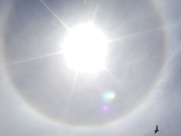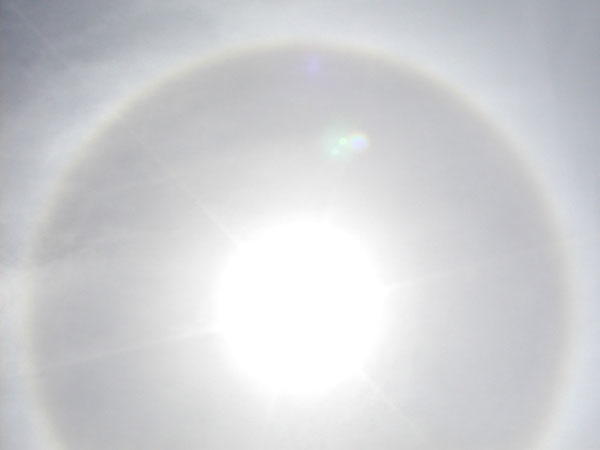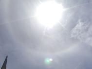 中午活动开始之前,大法轮在太阳周围出现,漂亮的彩虹光晕清晰可见。大约三个小时之后才逐渐散去。