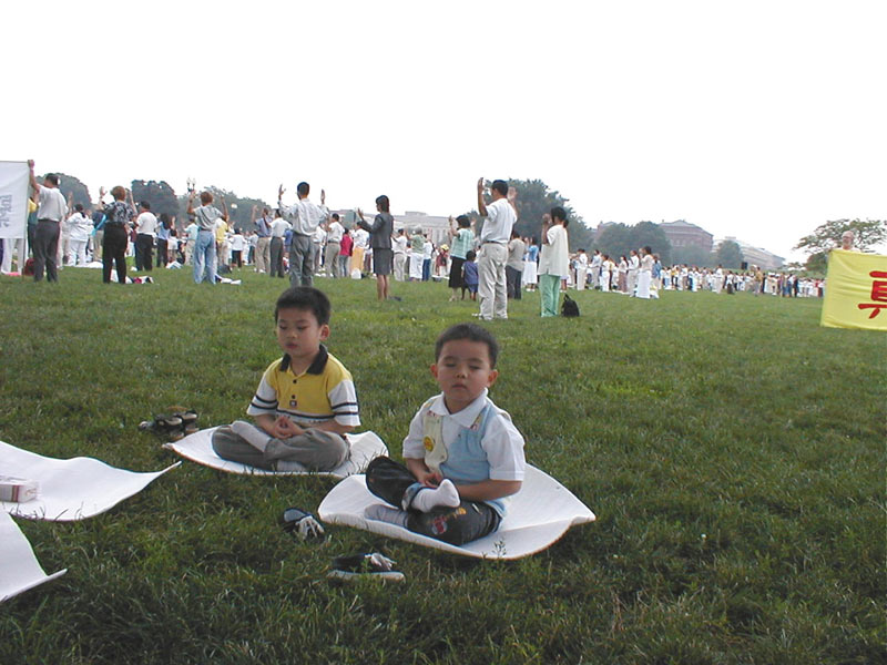 炼完第四套功法,云破日出,天空开始晴朗起来。9:00整,所有的学员在发正念的口令声中,神情肃穆庄严,立掌于胸,发出最纯净的正念。静功音乐响起,学员们开始炼神通加持法。几个小弟子们乖乖地在一旁安静地打坐入定。天真可爱的小脸上露出几分肃穆。9:40分左右,炼功完毕。DC的弟子们开始运送大家悉心制作的镶在木架上的大型图片,弟子们开始组排游行的队伍,为大游行做最后的准备。