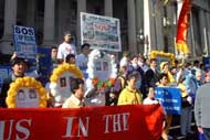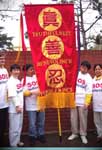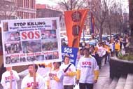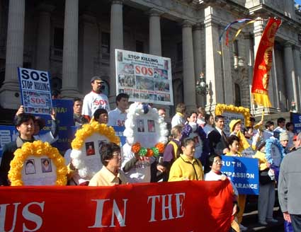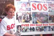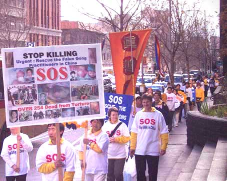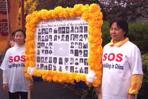 走在队伍最前面的是一面垂直的锦旗,上面有我们弟子精心绣制的“真、善、忍”三个大字。其他弟子有的举着“中国停止虐杀”、 “255名大法弟子被迫害致死”等牌子和横幅、有的捧着花圈,上面有两年中被迫害致死的法轮大法弟子的照片和简介。