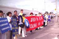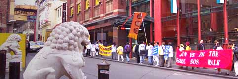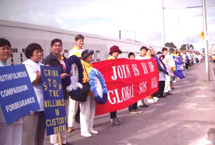 今天,在江泽民集团镇压法轮功两周年之际,为了揭露江泽民集团的罪 行,为了向世人讲清真象、为了呼吁全球紧急救援在中国大陆遭受迫害的法轮大法学员,我们墨尔本的法轮大法弟子与世界各地的大法弟子一起举行了一项和平、无声的步行活动。