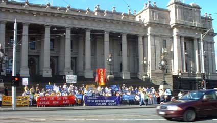 接着我们在市中心走了一个半小时,于大约下午两点钟抵达州议会大厦。参加我们步行的还有“2000年世界和平”地区代表里查德·弗莱彻和墨尔本市政府官员大卫·里斯特。弗莱彻并在州议会大厦前发表讲话,支持法轮大法弟子的人权。另外,“非暴力协会”也发来了一项对法轮大法支持的声明。