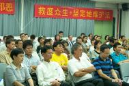 下午六点活动在普渡乐声中缓缓揭开序幕,首先全体学员齐声背诵论语,然后由同修上台朗读学员修炼心得体会。白衣学员捧着圣徒的照片在点点烛光衬托下使会场愈显庄严。讲台上朗读学员心得文章的同修频频因哽咽而语塞,台下静坐的同修更是潸然泪下,那篇篇呕心感人的体会、舍生护法的文章,激荡人心啊!多位重量级立委和政府官员也都到场表态支持我们此次活动的伟大意义,有数位立委说再过不久会加入我们的行列,联合报和民众日报也派记者到场采访拍摄,我们除了藉机向他们弘法外,也希望透过媒体和立委官员的传达让世人知道对大陆大法弟子的迫害的极其邪恶,同时启发世人心中的善念。