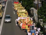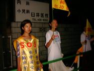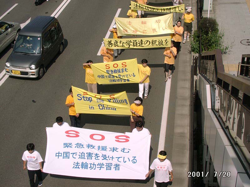 中午一点到三点全体学员开始从市民广场出发,沿仙台市主要街道绕行一周和平洪法,SOS紧急呼吁救援中国受虐待法轮功学员。在出发之前全体学员单手立掌再发正念,铲除三界内的一切邪恶。随后学员们手举“法轮大法”,“真善忍”、写有被迫害致死学员名字的松枝环绕的白色花圈及“SOS紧急救援中国受虐待法轮功学员”等横幅、旗帜,在“普度” 、“济世”音乐声中开始了游行。游行中有一段步行街,两边都是店铺,禁止放音乐、发报纸。学员们就举着横幅默默地行进。学员们印有”法轮大法” 、“真善忍” 、“SOS”的黄色、白色T恤衫和横幅的内容还是吸引了人们的注意力。由于街道窄,人们能清楚地看到横幅上的字,几乎人人都在读“SOS紧急救援中国受虐待的法轮功学员”,有人在小声议论。七月的骄阳似火,学员们一直在平静祥和地缓缓行进,包括老人和孩子。学员们默默地向世人昭示着大法的庄严神圣、迫害的残酷暴虐,慈悲地唤醒着人们的善念和良知。