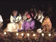 夜空下,圆形的广场周围石阶上,善良的人们三三两两坐在那儿肃穆地聆听学员心得,荧幕前数十位善良的人们专注地在看我们所播放的大法影带,图片展示区也是扶老携幼的善良人。