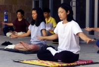 图三:吴来立(音译)和凯利-孙(右)及其他一些法轮功学员在沙漠微风公园的社区中心前示范一套功法。当地法轮功发言人梁开金(音译)说中国政府一开始对这一动作舒缓的冥想炼习是提倡的,但当他们认为这一运动的广受欢迎已成为一种威胁时,便于1999年7月禁止了该运动。