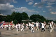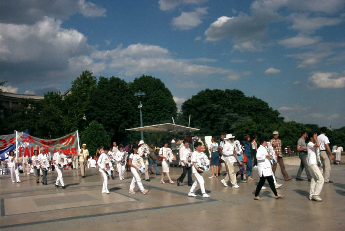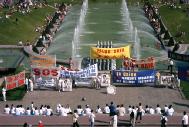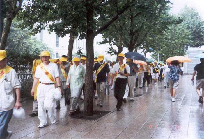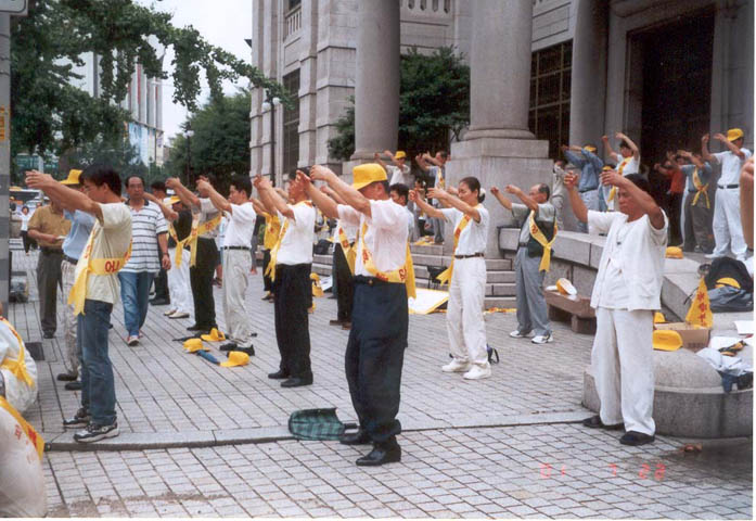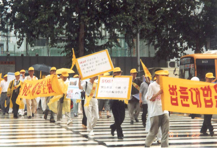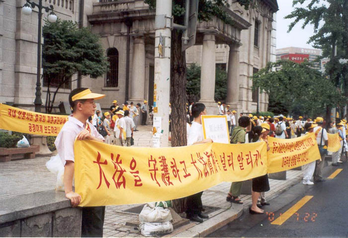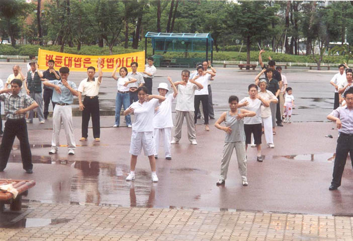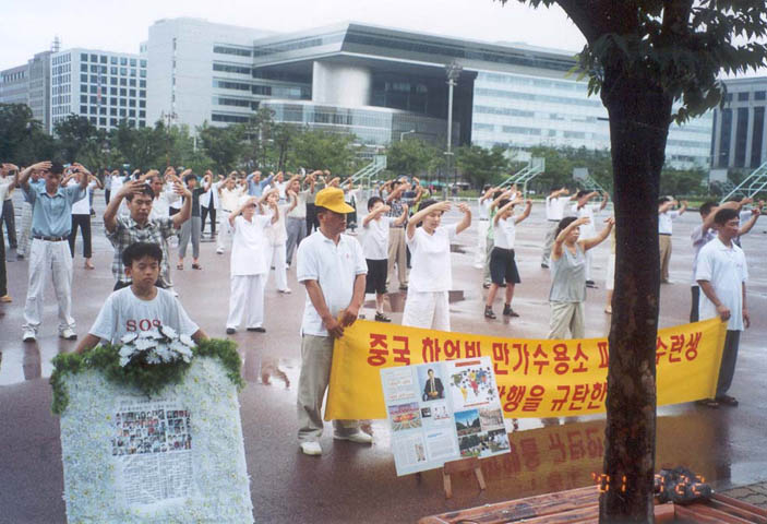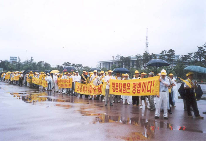 12时,"法轮大法是正法!","江泽民立即停止镇压法轮功!","江泽民立即释放所有逮捕拘禁的法轮功弟子!""愤怒声讨哈尔滨万家劳教所虐杀法轮功弟子的罪行!"等十余横幅出现在广场上,大法音乐回荡在汝矣岛广场上空。当200名学员整齐地举起双手刚炼第二套功法时,细雨蒙蒙,风雨交加。当一些"旁观者"纷纷打伞或躲到避雨之处时,上至七旬的老学员,下至10余岁小弟子无一人起动,齐刷刷硬是把半小时的抱轮动作做下来,蒙蒙细雨下的广场,200名大法弟子在风雨中安然不动,一股庄严神圣之气,一股浩然正气压倒一切之势可谓气壮山河!围观的人们被法轮大法弟子的这一壮举,触目惊心,竟忘了交头接耳和走动……