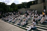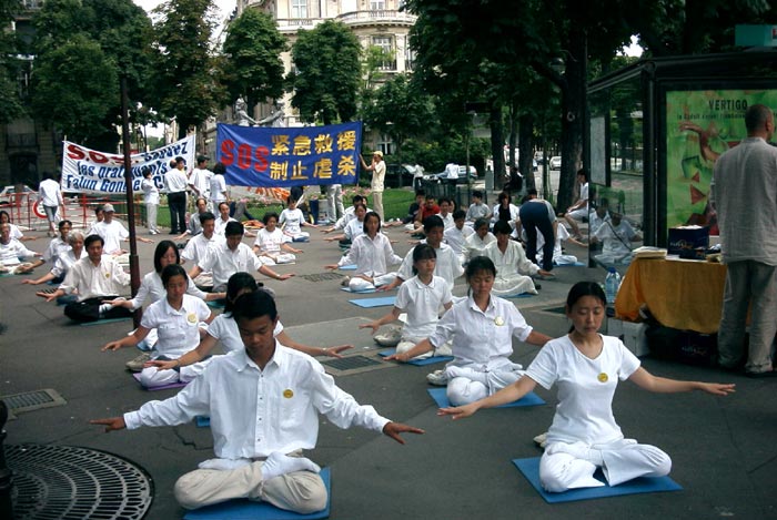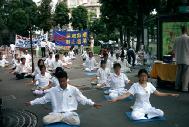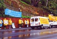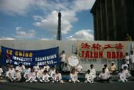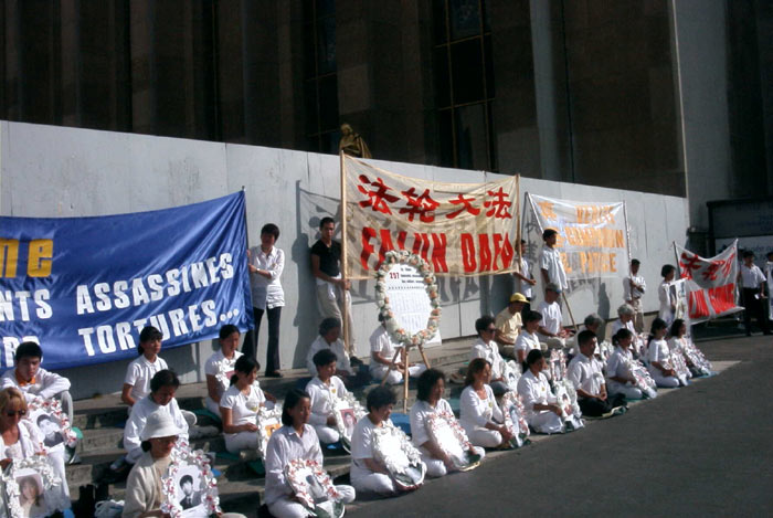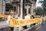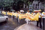 随着炼功音乐的响起,大家整齐地在中领馆门对面的路面上一字排开开始炼功,几名弟子同时向过路行人分发大法资料。由一个巨大的"奠"字为中心所编织的花圈及各色横幅标语向人们揭露着江泽民犯罪集团对大法及大法弟子的迫害以及呼吁中国政府制止江泽民一夥的犯罪行为。