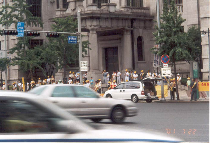 在韩国银行大楼前炼功与发正念至下午五时,历时五个小时的纪念722两周年、抗议江泽民迫害法轮功的正法活动结束。此活动有许多感人的事情,风雨之中当父母的没有动心,几个十余岁的小弟子硬是把一小时动作做完;明明有随行的车辆,年逾七旬的老年学员,身背幼儿的年轻夫妇学员硬是没坐车,冒雨行在正法的行列中,见此情景,警察情不自禁道:"法轮功真了不起!"