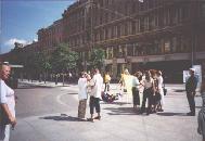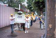 7月21日,二十多名弟子前往另一大城市利物浦洪法,主要是在市中心的一个小广场炼功发资料。也许北方人比南方人更憨厚,他们更容易为大法所打动,很多行人停步,静静地站着,长时间地观看学员炼功。人们也都是很友善的接过大法资料和SOS传单,很多人在请愿表上签名,呼吁中国政府制止江泽民一夥对法轮功学员的屠杀。