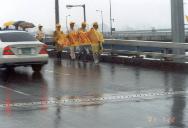在汝矣岛的炼功与悼念活动,五分钟发正念结束后,大法弟子们冒着风雨沿着原定路线穿越麻浦汉江大桥,穿过汉城火车站,其间大法弟子们边走边向行人散发传单,向世人讲清真相,3时40分到达了终点韩国银行,全程六公里。韩国银行正好与中使馆仅隔一条马路,而位于车水马龙的转盘道旁,又处于繁华的明洞区。大法弟子在这一地段散发真相资料,十余幅大法横幅摆在道旁,更显其正法意义。