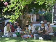 炼功完毕后,由两位学员念了师父的经文《正念的作用》。中午,更多的学员加入进来。母亲们带着孩子们在树荫下,和在正午热辣辣的太阳下的弟子们一起,一次又一次的发正念。下午三点多,学员带来了尊敬的师父亲临会场讲法的消息,许多学员的眼中闪烁着喜悦的泪水。围坐在草坪中间的大树下,在喧闹的车流中,学员们专心的聆听了师父的讲法录音。一位把自己的入场票让给别人的阿姨,再一次把离录音机近的位置让给了其他学员。