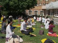 7月21日清晨,大法法会在庄重的肯尼迪音乐厅隆重开幕,虽然会场非常大,但仍容不下所有的弟子。在未能入场的大法弟子中,有二十几位同修来到中国大使馆前的草地上,集体炼功,发正念。天气异常的炎热,虽然只是早上九点钟,却已是骄阳似火。着装整洁的弟子们在草坪上整齐的盘腿而坐,面向着迂回而过的康尼地克大街。在上午的炼功和发正念的两个小时中,气氛庄严,周围十分宁静,孩子们也都很安静。迎面而来的车辆,轻轻的鸣笛致意,许多人摇下车窗,严肃而专注的望着炼功的学员以及悬挂在炼功场上方醒目的大标语“停止迫害法轮功学员”。很多行人停下来拍照,包括守在一边的警察。
