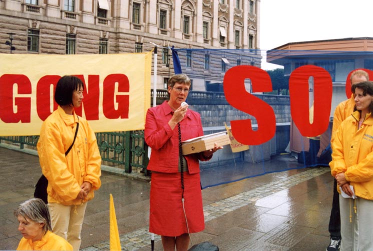 瑞典国家副首相琳娜.耶姆.瓦琳7月18日亲临记者招待会就中国镇压法轮功这一人权问题发表讲话,赞扬法轮功学员的正义行动,谴责江泽民集团的镇压暴行。