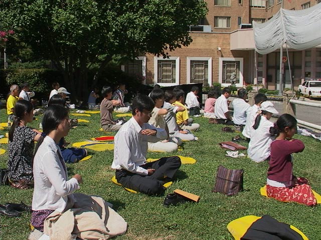 炼功完毕后,由两位学员念了师父的经文《正念的作用》。中午,更多的学员加入进来。母亲们带着孩子们在树荫下,和在正午热辣辣的太阳下的弟子们一起,一次又一次的发正念。下午三点多,学员带来了尊敬的师父亲临会场讲法的消息,许多学员的眼中闪烁着喜悦的泪水。围坐在草坪中间的大树下,在喧闹的车流中,学员们专心的聆听了师父的讲法录音。一位把自己的入场票让给别人的阿姨,再一次把离录音机近的位置让给了其他学员。