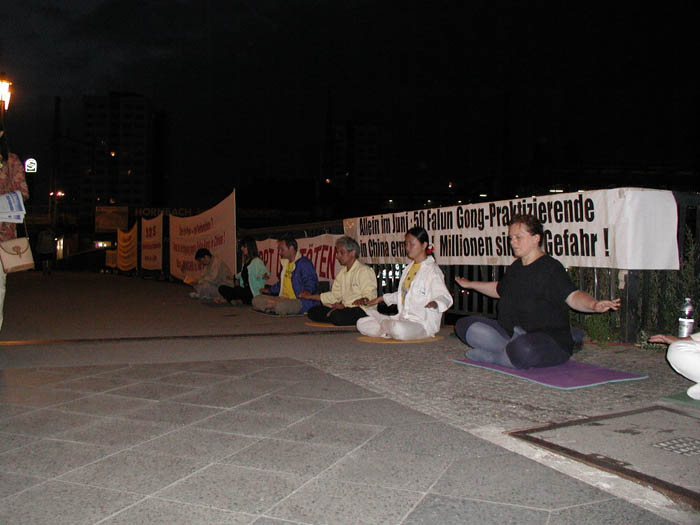 ·柏林的街道夜里依然车水马龙。许多出租车会重复路过我们所在的桥头。有一次,我们守夜时炼功,一辆出租车驶过时放慢了速度,我们赶快上前递上报纸。司机接过报纸说∶"我很多次经过这里都看见你们在炼功。我想给你们签名。"我们欣然让他签名后,问他还有什么好的建议,他说∶"你们现在这样就很好,只是场地太小了,你们该去市中心、人多的地方。"我们解释说这里是中国大使馆,他马上表示理解。最后他祝我们成功。
