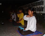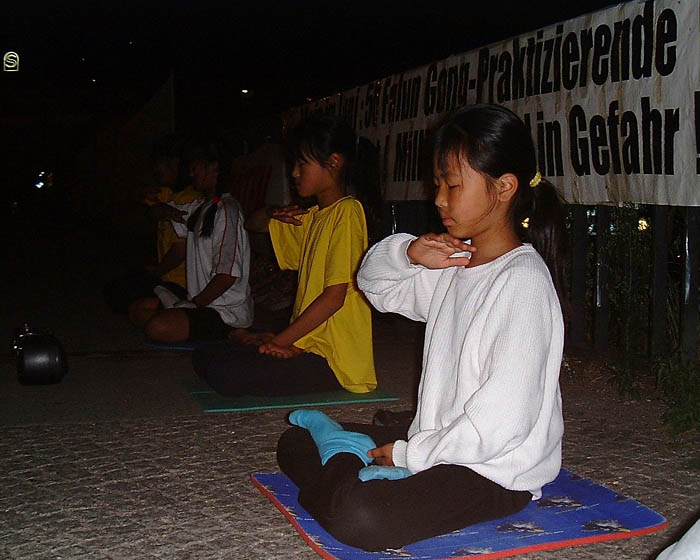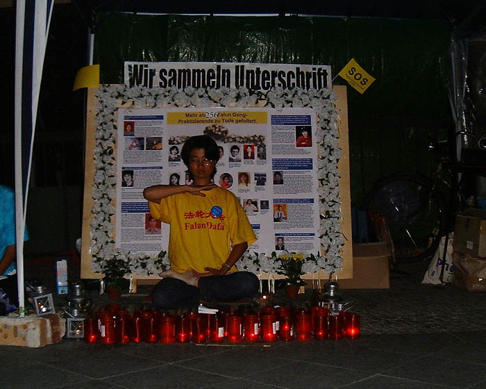 ·有天晚上,一个德国女孩来到我们的守夜烛光旁,说她读过她妈妈从我们这里拿回的报纸之后,有一个心愿,就是能亲手点燃一支守夜的蜡烛。我们都被她的真诚和善良感动。欣然答应她。她与守夜的学员谈了很多,临走时祝福我们,还要走了一张空白的签名表,说要参加我们的征签活动。