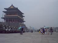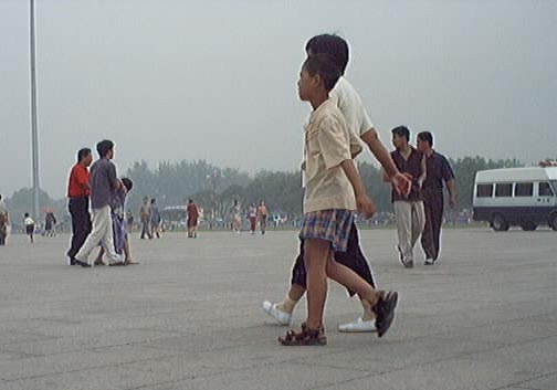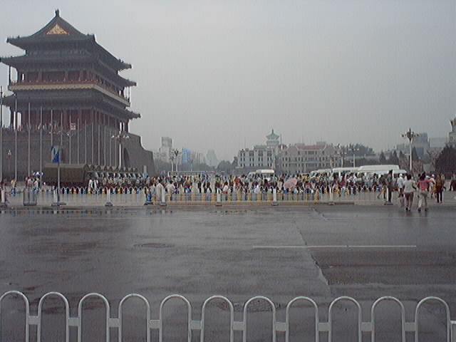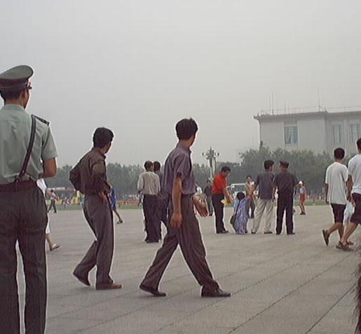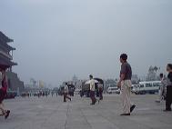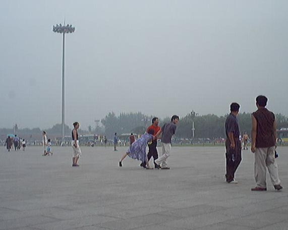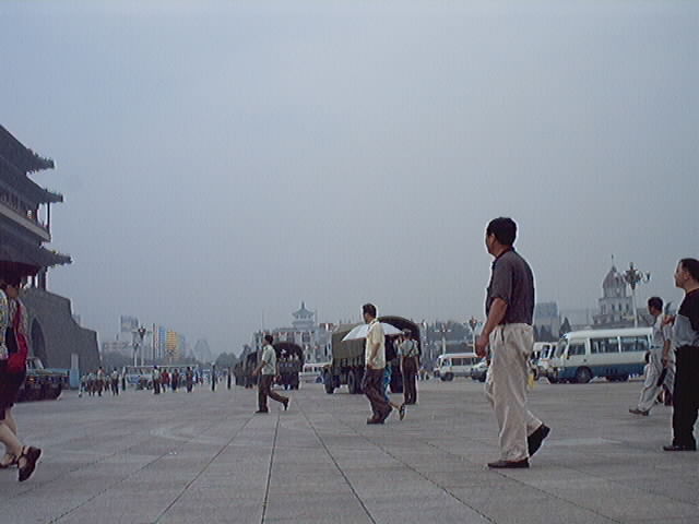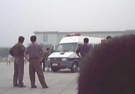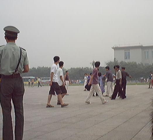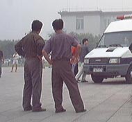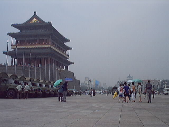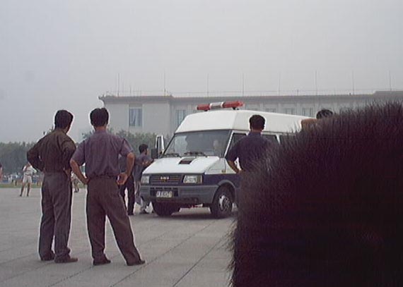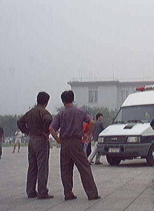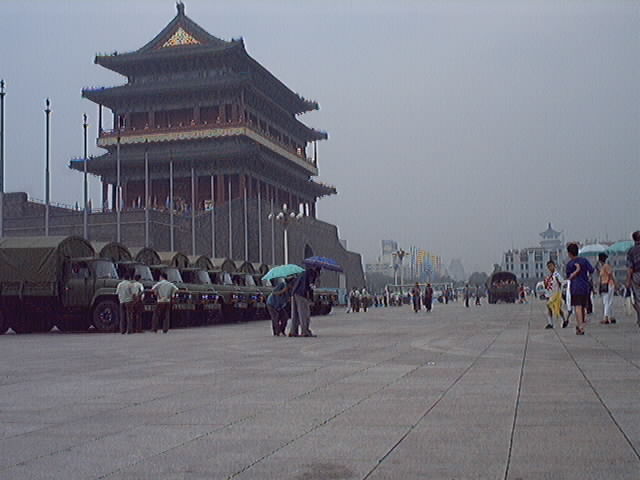 2001年7月19-20日短短两天内到天安门广场证实大法的弟子源源不断,被抓大法弟子无法统计,看看(图十至图十三中)前门与毛泽东纪念堂之间数十辆军车,就可知道邪恶势力的害怕心态!