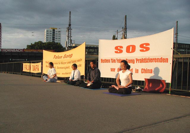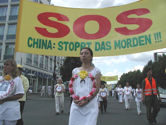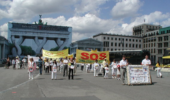行进中,我们在大街上发报纸,几名同修向大臣贾斯卡·菲思克尔(Joschka Fischer)递交了众多民意签名。当“SOS呼吁紧急救援”游行队伍到中国大使馆时,我们遇到了在那里坚持请愿200小时以上的大法弟子们。大家在一起进行了集体炼功并散发了介绍大法和揭露迫害的传单。