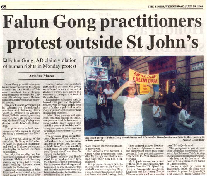 【明慧网2001年7月30日】最近,被大赦国际评为“人权流氓”的江泽民访问岛国马耳他,据马耳他时报报道,7月24日下午,当江泽民参观圣约翰大教堂时,5名法轮功学员成功的来到大教堂门口,展示法轮功的功法,顿时成为在场媒体和民众关注的焦点,令江泽民大为吃惊。当5名法轮功学员开始发正念铲除邪恶时,当地善良的民众打起放在一边的法轮功横幅和中国学员受