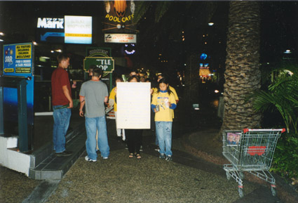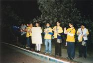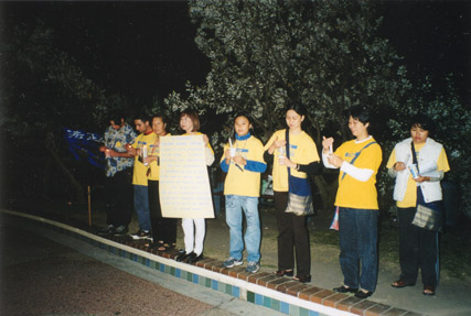 八点,我们大法弟子移往“滑浪者天堂”海滩前方挂上横幅,即开始烛光追悼被迫害致死的学员。马路上的过路人不断和我们握手,表示支持。使我们觉得应帮助更多的人得法。其间,巧遇一团北京来的官员,其中有搞官方资料的,他说:「政府制造假新闻搞得太过分了!」他真诚地想从我们这了解更多真相。我们得加倍努力向世人讲清真相。