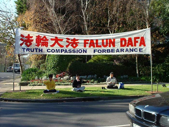 当得知15名女大法弟子在万家劳教所被残害致死的消息之后,墨尔本学员于7月4日上午10点在中国驻墨尔本总领馆门前举行了新闻发布会,向世人揭露江泽民流氓集团的残暴以及中国法轮功学员随时都有生命危险的紧急情况。学员们分别于10点、11点和12点发正念铲除邪恶,在寒风中炼功、静坐。有不少过路行人停下来看图片版、索要资料。一位来自广州的中年妇女非常同情国内学员的遭遇,对我们的行动表示钦佩。一位西人中年男子在发布会结束后仔细地询问法轮功的情况。