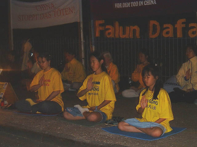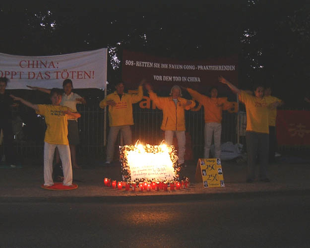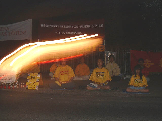 昨天傍晚,当我们刚炼完最后一遍功,准备收拾东西离开中领馆时,我一抬头刚好看到一名中国官员陪送一名西装革履的德国人走出领馆大门。这位德国人一出领馆的大门就和负责我们活动的警察交谈起来了。我想:“这人没准是个生意人或政府官员。”于是拿了一些法轮功的资料就向他走去。他友好地接过了我给他的资料。交谈中得知他是刑警局的,专门负责在德国的外国使、领馆的安全。他告诉我中领馆的领事抱怨说不该允许我们在领馆门前抗议。领事极为不满。于是,刑警局的官员开始和我商量,看我们能否向左边或右边移一些,别对着领馆的大门。领馆旁边就是一大片灌木林,这就意味着让我们对着灌木林去抗议、请愿。