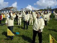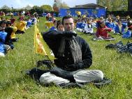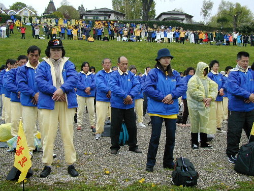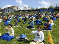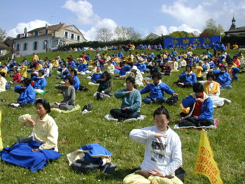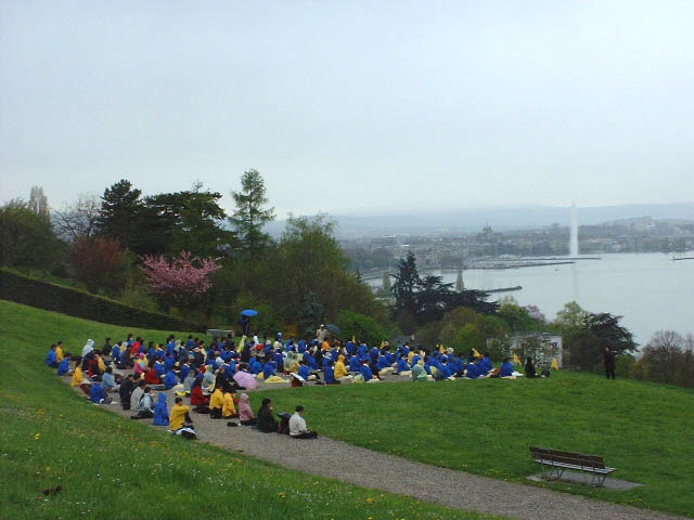 【明慧网2001年8月1日】四月十九下午,日内瓦下着连绵不断的小到中雨,约400名法轮功学员在黄气球引导下,冒雨来到日内瓦湖边的山坡上参加这次难得的集体户外洪法炼功活动。