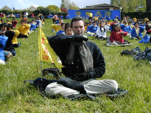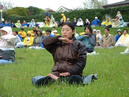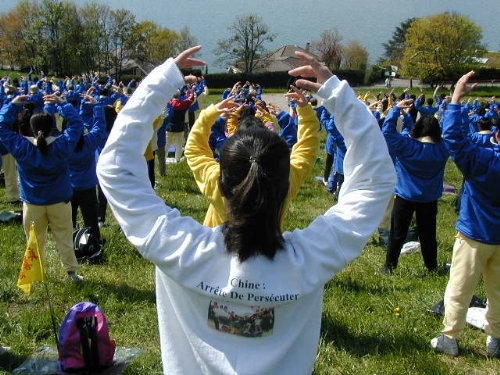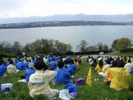 法轮功学员在日内瓦湖边冒雨集体炼功
