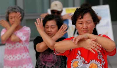 图片一:星期三一早,一群妇女在罗伊尔德.乔治(Lloyd George)联邦法院前炼习法轮功以唤起人们对中国政府