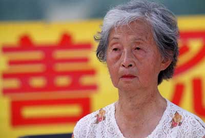 图片二:来自加州圣加伯利(San Gabriel)的80岁的马春埔(音译)在集会上发言。春埔称赞法轮功从疾患中挽救了她。她说她因为拒绝停止公开炼功而在北京被关押了三天。