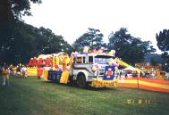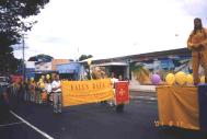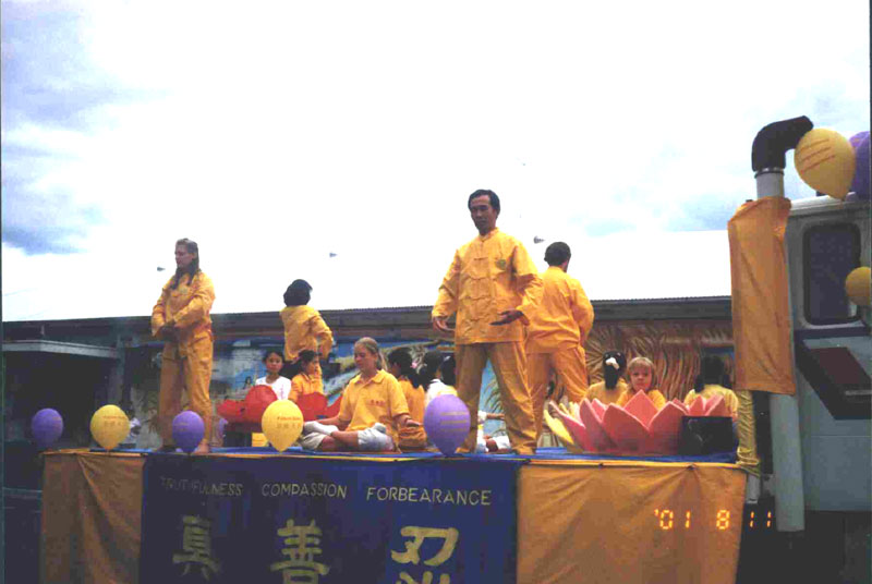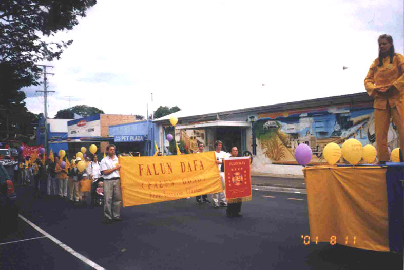 【明慧网2001年8月15日】8月11日是一个气候宜人的星期六。图文巴、卡布切、阳光海岸、布里斯本、黄金海岸等地的大法弟子聚集在南博市参加这里的"蔗糖节"游行庆祝活动。学员们精心布置了巨大的花车:车的顶棚上是一朵美丽的莲花。车前边是"法轮图形"和"法轮大法"的横幅。四周用中英文"真、善、忍"横幅及印有"法轮大法""真、善、忍"的彩色气球装饰。六名小弟子分坐在黄、粉、红色漂亮的莲花台上。四名身着黄色中式炼功服的中西方学员分别缓缓演示前四套功法的动作。其它小弟子围坐莲花台周围打坐,形成一幅动人的画面。