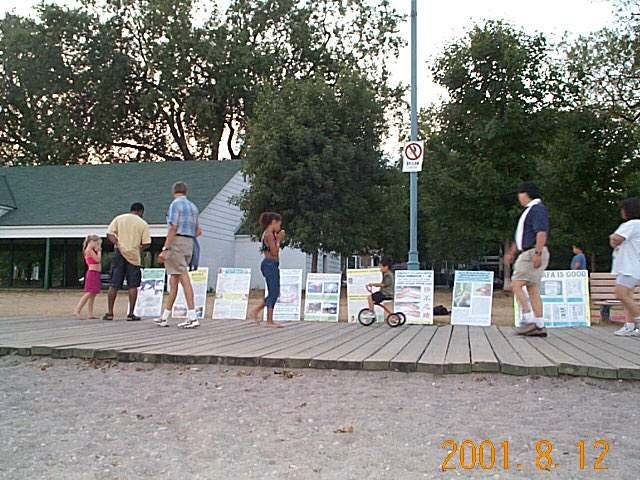 多伦多今年天气炎热,晚上出来纳凉、散步的人很多,这同时也给我们讲清真象、洪法带来了机会,充分利用师父留给我们的每一分钟。于是我们把晚上在家学法、炼功,改在路边、公园和湖边,同时展出我们的展板,把签名册放在一边。我们感觉在安大略湖畔效果最好,几乎所有路过的人都看展板。甚至天黑了,人们依然不肯离去,有的蹲下来,或趴在展板上看。