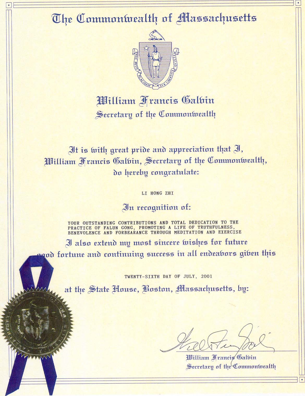 马萨诸塞州众议院表彰法轮大法创始人李洪志先生