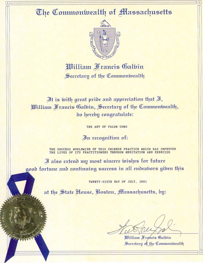 马萨诸塞州众议院表彰法轮大法创始人李洪志先生