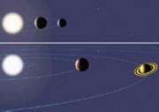 【明慧网2001年8月18日】明报消息,美国一班天文学家最近在距离地球约五十一光年的大熊座,首次发现一个类似太阳系的星系,里面最少有两颗像木星大小、给气体包围的行星,以接近圆形的轨道,围绕一颗叫做「大熊47」的恒星而运行。目前科学家在太阳系外发现的约七十颗行星中,大部分都是以非正圆的轨道,在极近距离环绕恒星,今次发现的星系可说与我们的太阳系最相近。上图为大熊47的星系,下图为太阳系。