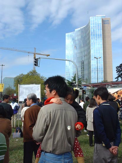 4月17日晚,400多名法轮功学员在国际红十字会前的山坡上举行烛光纪念活动,纪念在中国遭受迫害的法轮功学员。活动正对联合国的大门,许多参加联合国会议的各国代表和官员都被这慈悲、祥和的场面所感动,为法轮功遭受的无理打压感到不平。一官员走下车来,大声地对静坐的学员说:“太感人了,我相信法轮功的问题一定会得到解决。”另一感人的场面是:晚上,太阳落山后天气很凉,许多学员穿的比较单薄,但一直坚持了三个多小时。这时只见一位过路行人,默默地将自己带的衣服披在一位学员身上……