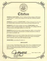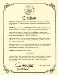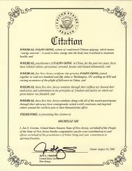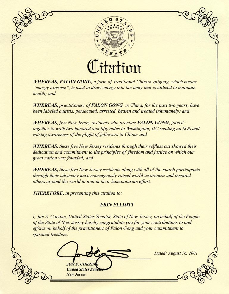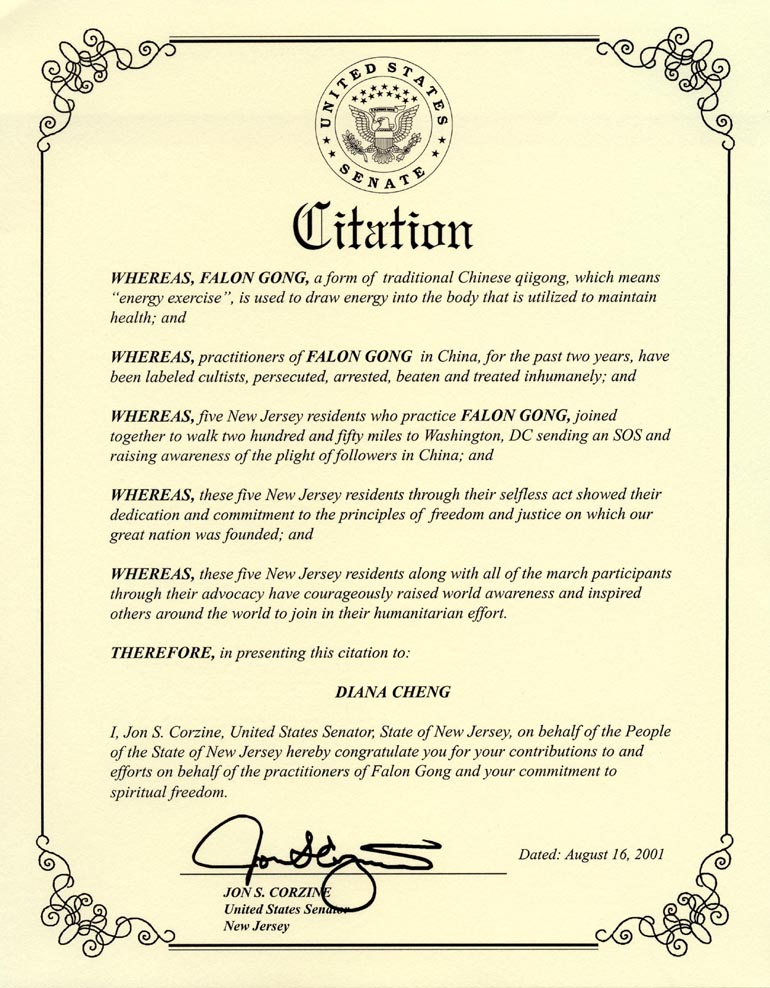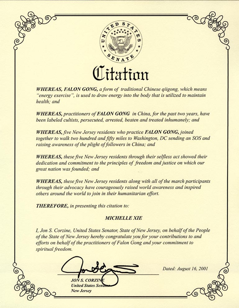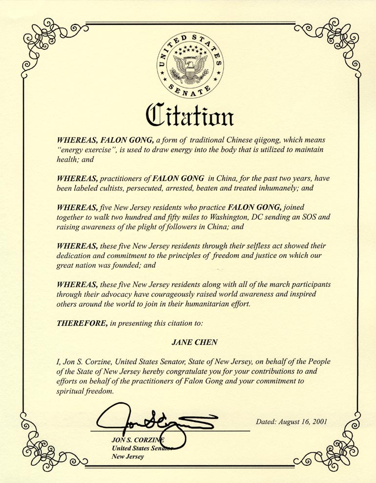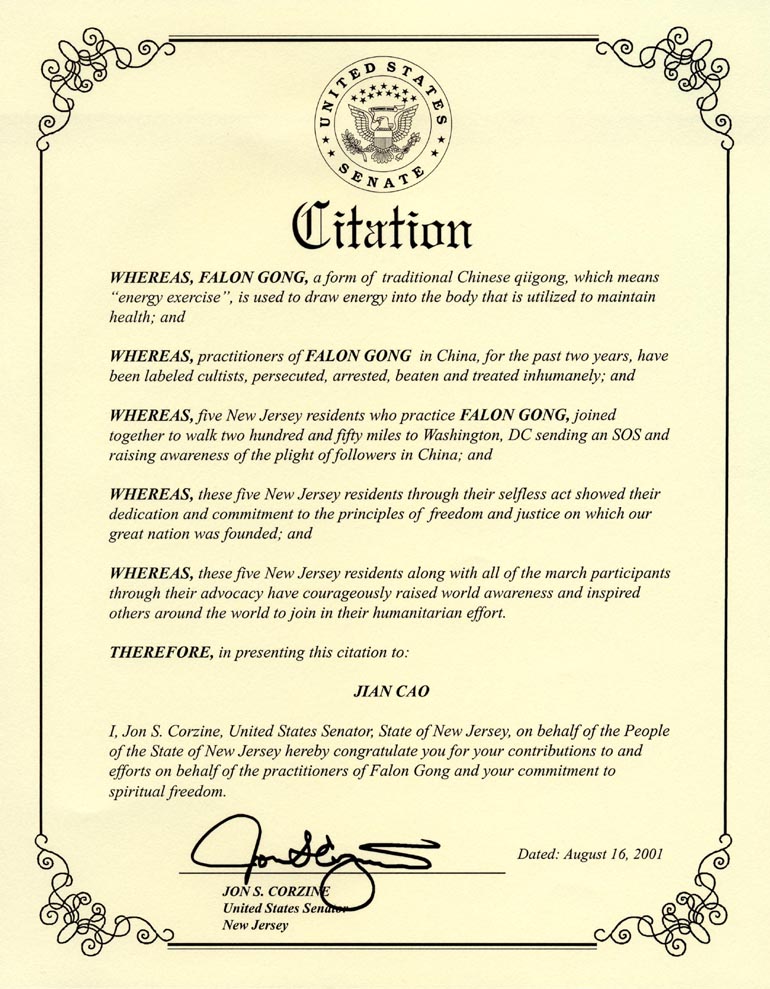 我,Jon S. Corzine,作为新泽西国会参议员,代表新泽西人民向你们对法轮功学员的贡献和努力及你们对精神自由的奉献表示祝贺。