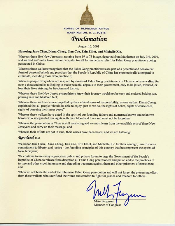 【明慧网2001年8月20日】Michael Ferguson在褒奖中称世界各地的人民都被中国法轮功学员争取自由和公正的故事所激励,中国的许多法轮功学员步行了一千多哩路到北京和平上访,却遭到拘押、折磨甚至杀害。而和平非暴力的法轮功学员应享有和我们一样信仰的自由、追求良心和心灵宁静的权利。