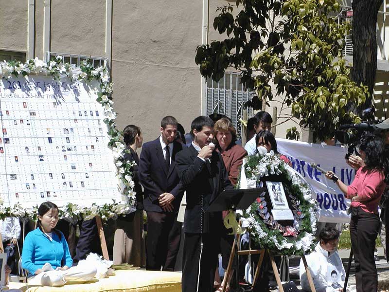 国会议员南希.珀楼西(Nancy Peloci)通过她的助理致词表示,“我支持为纪念263位被迫害致死的法轮功学员进行的263小时静坐活动,并呼吁中国(江泽民)政府尽快释放包括美国居民滕春燕医生在内的所有法轮功学员。”致词还表示,“…任何国家关押成千上万追求自由与理想的人民的行为都是错误的”,“针对这些平和的修炼人的镇压必须立即停止”。国际特赦组织也派代表参加了今天的新闻发布会。