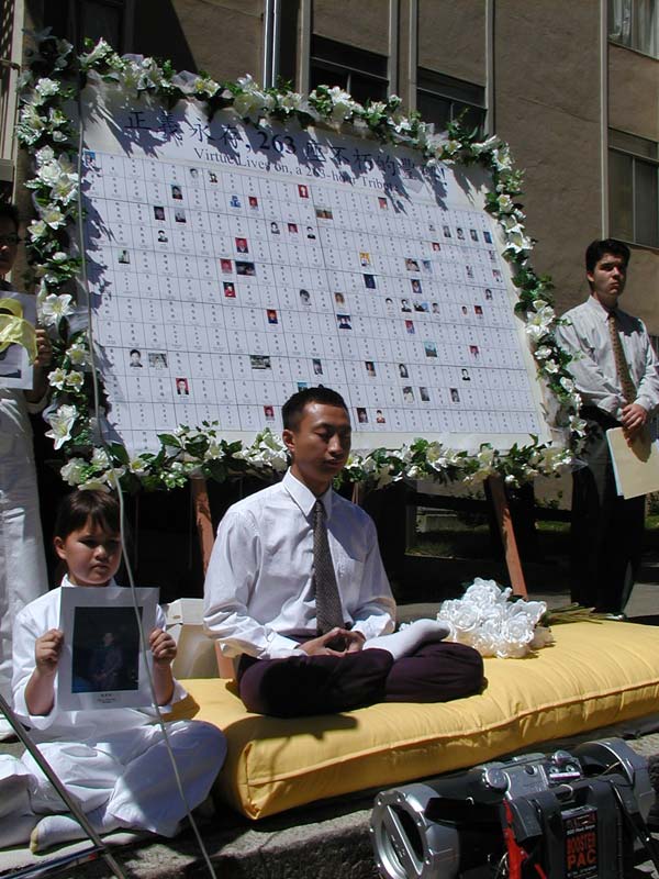 【明慧网2001年8月21日】 为纪念在过去两年邪恶镇压中失去生命的大法弟子,唤醒所有善良的人们共同起来反对这场历史上最黑暗残酷的镇压,旧金山大法弟子于美西时间8月19日中午12点开始在中领馆前持续263小时静坐。