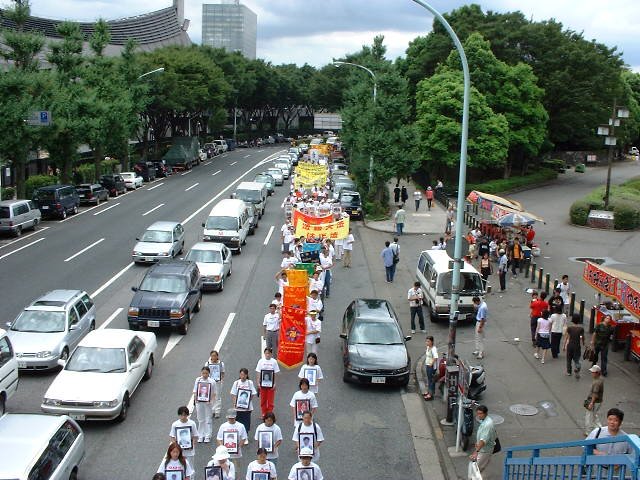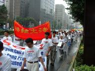 下午一点全体学员开始SOS紧急救援的和平游行。在出发前,又开始下起小雨,大家三发正念,雨停了。学员们身着印有红色“SOS”字样和日语“紧急救援中国国内受迫害的法轮功学员”的白色体恤和“法轮大法”、”真善忍“的黄色体恤,有的举着”法轮大法”、“真善忍”、”SOS紧急紧急救援中国受迫害的法轮功学员”的横幅和各色大法的旗帜,几岁的小弟子也手拿着”法轮大法”、“真善忍”的小旗,许多学员手捧着被迫害致死的学员的遗照,大家神情庄严凝重,在“普度””济世”音乐声中,从涉谷区的一个小公园出发,开始默默行进。一些学员在马路两侧向路人派发SOS紧急救援的真象报纸。人们都关切地注视着SOS紧急救援中国受迫害的法轮功学员的标志,许多人接过报纸急切地读起来。在游行过程中抬头仰望天空,只见阴云一直如影随形,好像在跟着队伍走,一会儿仿佛是一个罩一样笼罩在天空。走到最后一段路时,又开始淅淅沥沥地下起小雨来,渐渐地雨越下越大,风也刮起来了,温度骤然降低。在行进过程中一直有学员在自觉地持续发正念,此时变为全体学员齐发正念,共同除恶。学员们的衣衫湿透了,头发在滴水,但大家仍然在默念“法正乾坤,邪恶全灭”、“法正天地,现世现报”。走在这支在雨中行进的队伍中,感到悲壮肃穆,感到学员们救度世人的赤诚之心和清除邪恶的坚定无畏。在人间表现出来的是风雨交加,在另外的层层空间中也许正邪交锋,激战正酣。历时两个半小时的和平游行在闹市区新宿都厅附近结束。