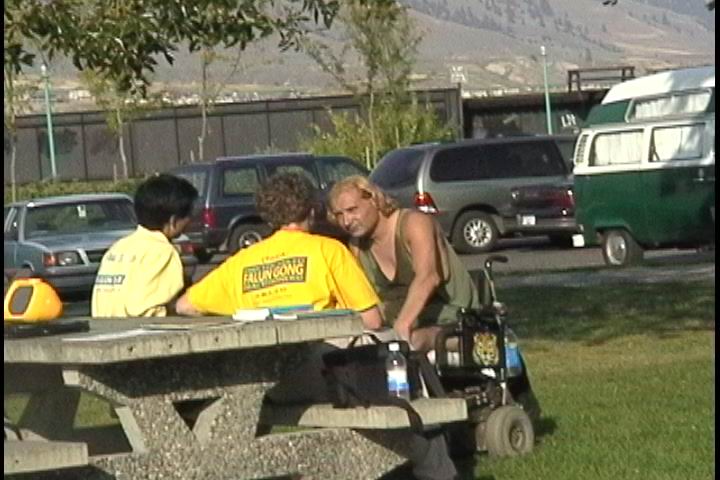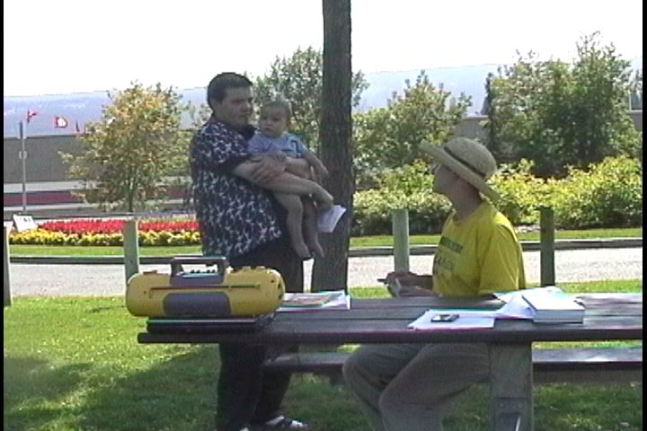 有一位西人老人,当我们给他递上材料时,他说:“我的眼睛看不见字。”于是我们就告诉他法轮大法的平和和他带给人们的美好,但在中国却遭到残酷镇压,很多人被折磨死,包括几个月的婴儿。他听着听着泪水涌出眼眶,不停地说:“太悲哀了,你们终于离开了那里(中国),来到加拿大,这太好了!”