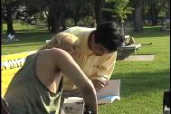 孔子像广场位于中国城中心,位于五条街的交接处的三角地带。周末更是行人和车辆的必经之地。学员们充分利用这特殊的有利地势。大家智慧地把大量讲清真象、正法之路的图片、学员炼功场面的大型海报以及中英文法轮大法横幅摆了一圈。图片醒目地对向各个方向,使所有的过往行人和车流都能看到。整个洪法点布置得非常壮观。学员们在里面炼功。高音喇叭里反复播放着法轮功的神奇故事,及“4-25集体上访”,“天安门自焚”等真象。许多行人或在图片前驻足,认真仔细地观看,或认真地聆听真象广播,对中国法轮功学员的悲惨遭遇深表同情,对江泽民政府的暴行表示不解和愤慨。放资料的桌子面向人最多的一面,不少人自动来拿资料。