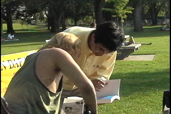 这几天又不少有缘人接触到了大法,了解到了真相。前天有位警察也来签字。一位德国小伙子已经借阅过《中国法轮功(修订本)》和《转法轮》。前天他又来为其朋友借《中国法轮功(修订本)》。一位练过太极和少林拳的非洲小伙子听闻连美国太极拳王现在都改炼法轮功了,非常振奋,与学员聊了很久很久。一位华盛顿人两次专程为“普度”和“济世”大法音乐而来……
