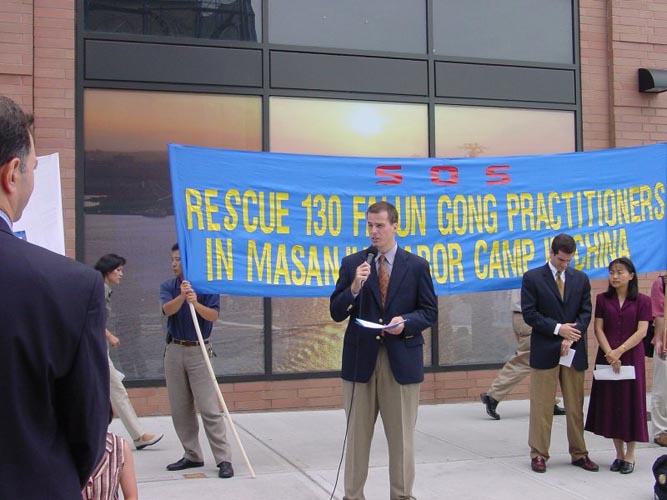 【明慧网2001年8月23日】截至8月21日中午12:00点,大纽约地区大法弟子在中领馆前绝食、130小时连续静坐请愿已进入第五天。下午12:00-1:00,近百名大纽约地区的大法弟子在中领馆前召开新闻发布会,再一次强烈呼吁中国政府立即无条件释放马三家劳教所130名绝食已超过20天的法轮功学员,立即无条件释放被非法判刑3年的美国学员滕春燕。